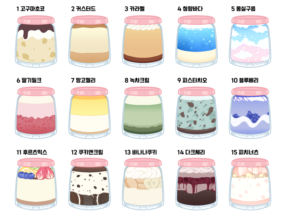 ❀함께 진열되는 푸딩은 아래 15가지 중 선택합니다. (지정이 없을 경우 캐릭터와 어울리는 색으로 랜덤 배치합니다.)